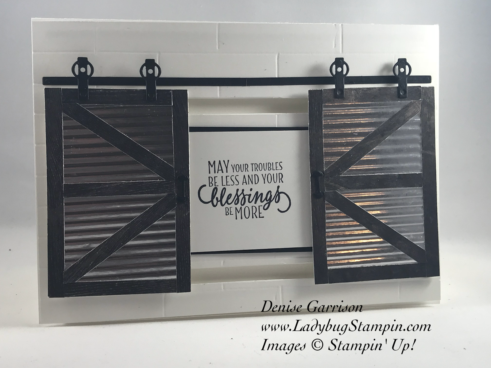 The first time ever I saw your face....ok I am not sure how the rest of the song goes. But I felt that way when I first placed my eyes on the new Stampin' Up! Bundle Barn Door. I knew right away I wanted this set, and would use for a long long time.We are in the planning stages of building a smaller (800sq feet) home, and the walls will be shiplap with barn doors to save on space. I am not sure yet on the corrugated metal but you never know what this card might inspire.